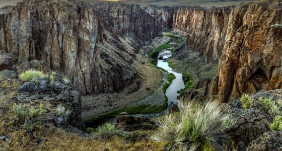 The canyons of the Owyhee River are dramatic, awe-inspiring landforms. Reddish-brown canyon walls, sharply contrasted by the colorful, eroded chalky cliffs, reach up to 1,000 feet above the pristine sagebrush and grass-covered and talus slopes that form the river’s edge. Cliffs occasionally drop hundreds of feet directly into the river. The canyon rims are often eroded into a multitude of towering spires, while in other areas the canyon walls reach to the sky as fractured, blocky monoliths tinted with brilliant green, yellow, and orange microflora.